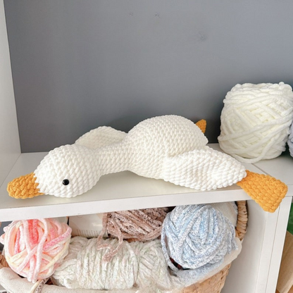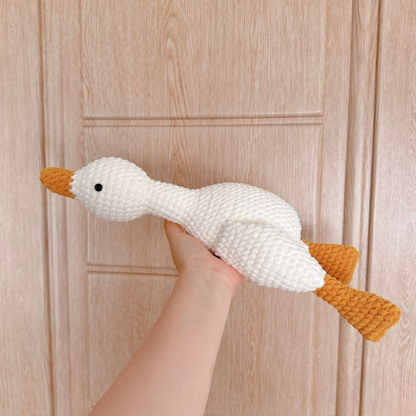 Want to stitch something soft, squishy, and guaranteed to bring a smile? This no-sew goose plushie works up into a 15-inch cuddle buddy—legs, wings, and bill are all crocheted in one.